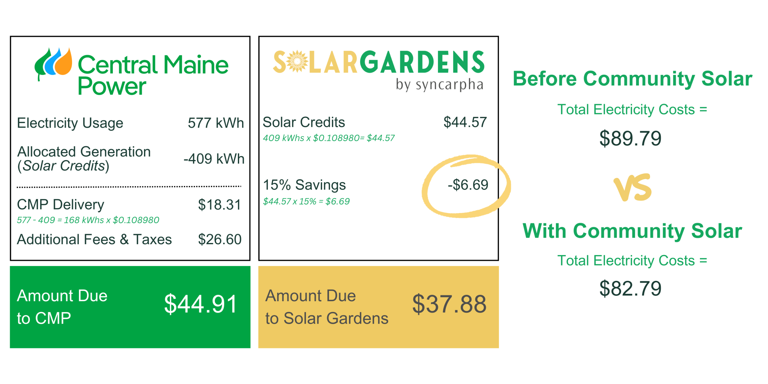 Each month, you’ll see solar credits applied toward reducing the cost of your Central Maine Power electricity bill. Then, you’ll receive a separate bill from Solar Gardens Maine for the value of those solar credits, discounted by 15%. Despite receiving two separate bills, combining your monthly Central Maine Power electricity bill and your Solar Gardens bill ensures you always pay less than you would without community solar!